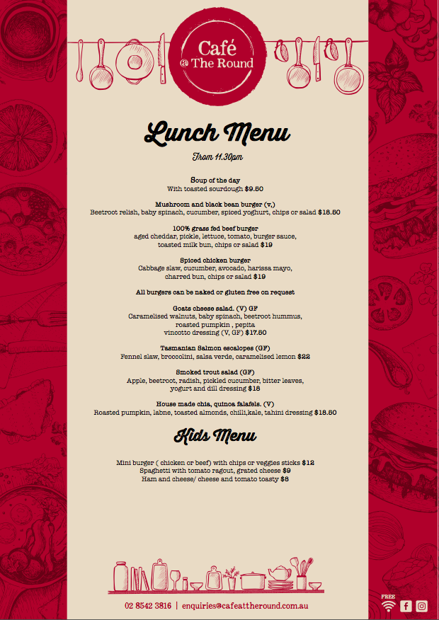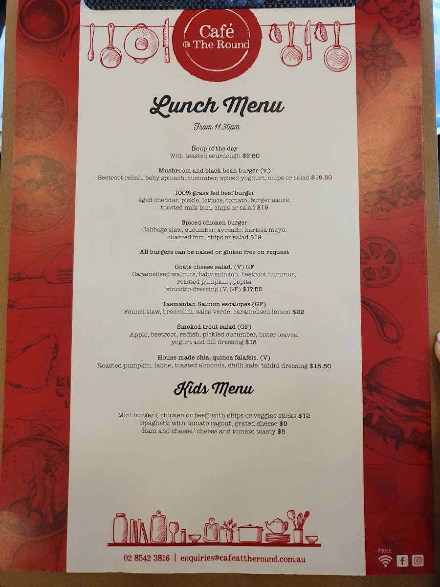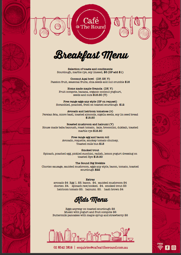 Located at 54 Thompson St, Drummoyne NSW, Cafe @ The Round offers a diverse menu suitable for breakfast, lunch, and casual dining occasions. The menu is organized into distinct sections, providing a range of food and drink options throughout the day.